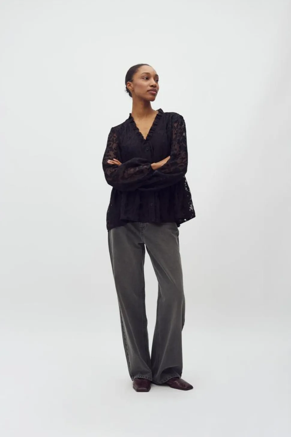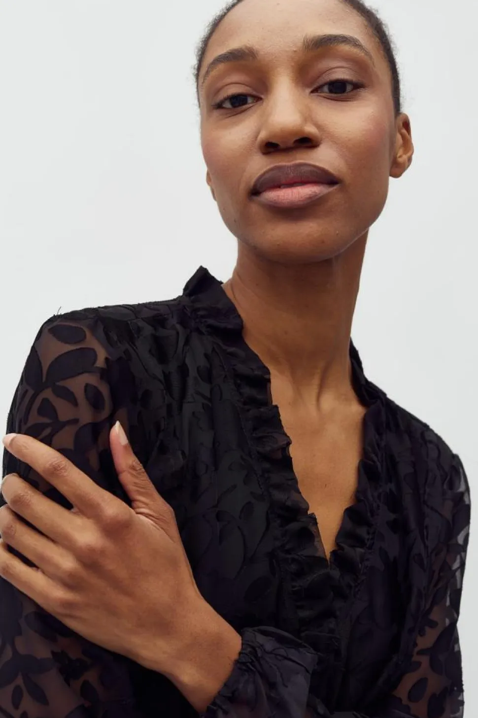 Denne skjorte er designet med en elegant V-hals, der giver et sofistikeret udtryk. De lange ærmer tilføjer en klassisk dimension til skjorten, hvilket gør den ideel til både arbejde og fritid. Knaplukningen foran er både praktisk og dekorativ, og giver mulighed for at justere looket efter behov. En markant detalje ved Gorgia-M skjorten er dens flæsekant rundt i kraven, som tilføjer en smule romantik til designet. Det delikate blomstermotiv bidrager yderligere til skjortens charmerende og feminine stil, hvilket gør den til et oplagt valg for dem, der ønsker at tilføje lidt farve og mønster til deres outfit. Den almindelige pasform sikrer en behagelig og flatterende silhuet. mbyM har med denne skjorte skabt en alsidig beklædningsdel, der kan styles op eller ned alt efter anledning.