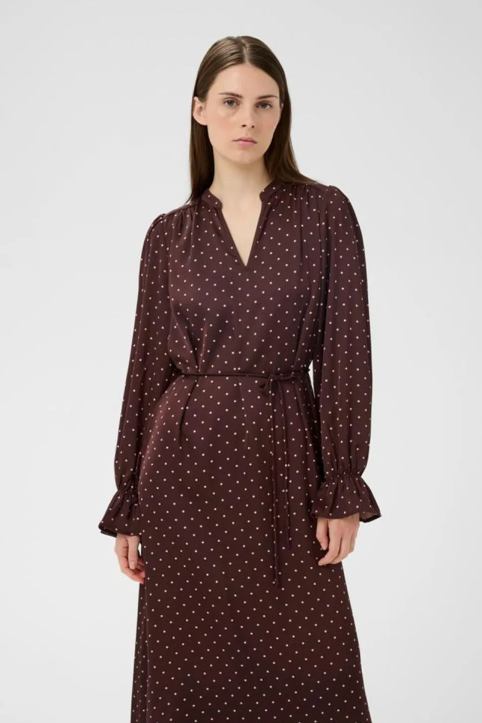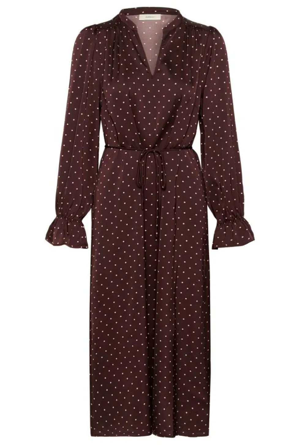 ZaniaIW kjolen fra InWear er det perfekte valg til den stilbevidste kvinde, der ønsker en kombination af elegance og komfort. Denne smukke kjole har en midi-længde, der gør den ideel til både hverdag og fest. Den langærmede udformning med en charmerende V-udskæring tilføjer et sofistikeret touch til din garderobe og giver dig et alsidigt look.Kjolens prikkede mønster skaber et tidløst udtryk, mens bindebåndet i taljen fremhæver din silhuet på fineste vis. For enden af ærmet finder du en delikat flæsekant, der tilføjer et elegant og feminint finish. Med en almindelig pasform sikrer ZaniaIW kjolen maksimal komfort uden at gå på kompromis med stilen. Alt i alt er denne kjole et must-have for enhver, der ønsker at udstråle selvsikkerhed og charme i enhver situation. Gør denne klassiske og moderne kjole til en del af din garderobe i dag.