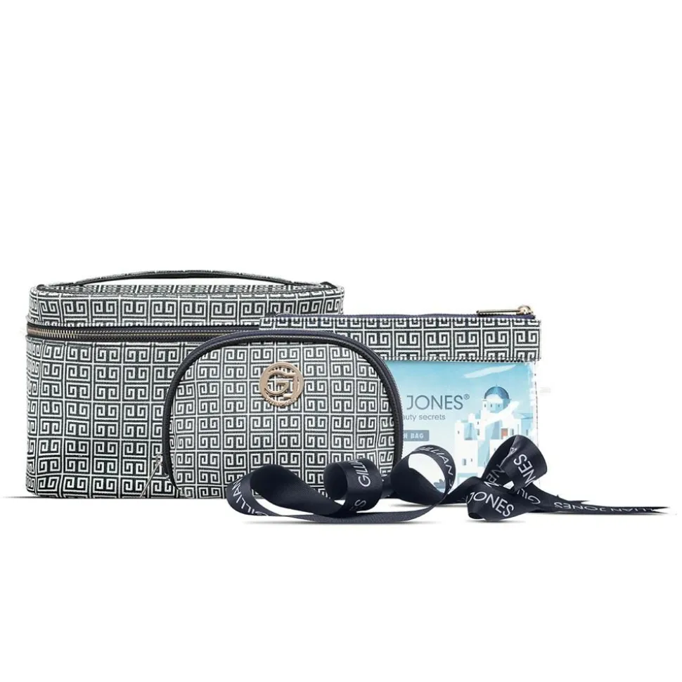 Boks sæt med 3 dele i blåt og hvid GJ signatur print. Her er alt hvad du har brug for til din rejse. Fremstillet i 100% genanvendt plastik, der nemt rengøres med en fugtig klud.