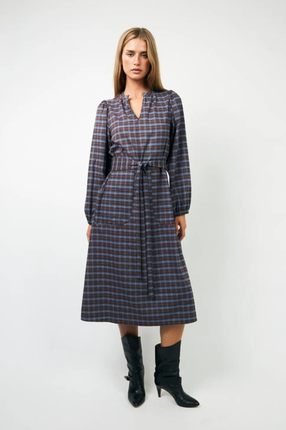 Oplev elegance og komfort med ParisLL Kjolen fra Lollys Laundry, der er designet til at imponere ved enhver lejlighed. Denne lange kjole er lavet i en smuk midi-længde, som giver den et sofistikeret og tidløst udtryk. Den har lange ærmer, hvilket gør den ideel til både de kølige dage og de varmere aftener. Den smagfulde V-udskæring tilføjer et feminint touch og gør den velegnet til både formelle og uformelle sammenkomster. Et bælte i taljen giver kjolen en flatterende silhuet, der fremhæver figuren på en elegant måde. Det klassiske ternede mønster tilføjer et moderne og stilrent look, mens den almindelige pasform sikrer komfort hele dagen. Uanset om du styler den med høje hæle til en festlig begivenhed eller med flade sko til en mere afslappet anledning, er ParisLL Kjolen et alsidigt valg, der kan tilpasses mange forskellige stilbehov.
