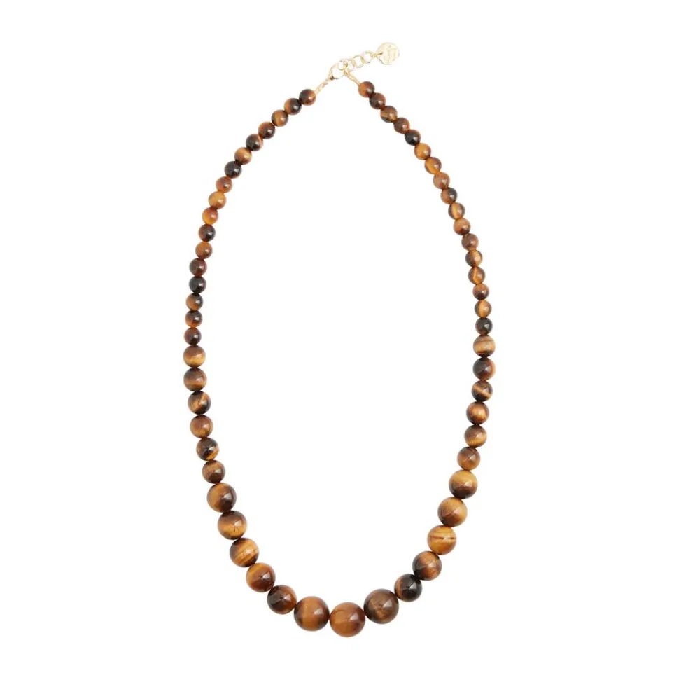 Opdag skønheden i denne elegante Tigereye halskæde fra Friihof+Siig, der kombinerer tidløst design med naturens egne materialer. Denne halskæde er en fremragende repræsentation af Friihof+Siigs evne til at skabe smykker, der både er stilfulde og unikke.Halskæden er udstyret med en guldbelagt lås, som tilføjer en luksuriøs glans og sikrer en holdbar lukning. En af de praktiske funktioner ved denne halskæde er dens justerbare længde, der gør det nemt for dig at tilpasse smykket til forskellige outfits og anledninger. Dette giver dig friheden til at bære halskæden tæt omkring halsen eller lidt længere, afhængigt af din stil og præference.Halskæden består af smukke tigerøje sten i et elegant forløb, der skaber en betagende visuel effekt. Tigerøje stenene er kendt for deres varme, gyldne nuancer og unikke mønstre, der gør hver enkelt halskæde til et særpræget kunstværk. Uanset om du bærer denne halskæde til hverdag eller ved særlige lejligheder, vil den uden tvivl tilføje et strejf af elegance og personlighed til din stil.