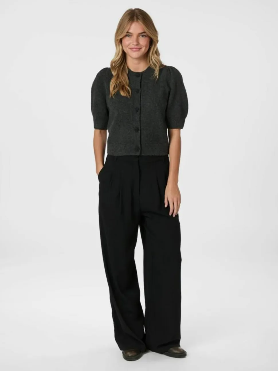 Trudy Deco Knit Cardigan fra Neo Noir er en stilfuld tilføjelse til din garderobe, der kombinerer elegance og komfort på fineste vis. Denne cardigan er designet med korte pufærmer, som tilføjer et feminint touch, samtidig med at de giver en moderne silhuet. Med sin runde halsudskæring og ribkant, tilbyder cardiganen en klassisk stil, der passer til enhver lejlighed. Denne cardigan har en almindelig pasform, hvilket gør den behagelig at have på hele dagen. En af de mest bemærkelsesværdige detaljer er de dekorative knapper med perler, der giver et strejf af glamour og sofistikation til designet. Perfekt til både hverdag og mere formelle begivenheder, kan denne cardigan nemt styles med både jeans og nederdele.
