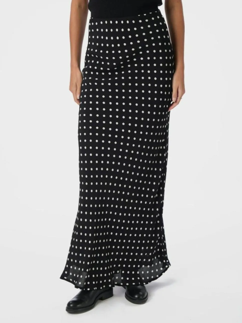 Viso Crepe Dot Nederdel fra Neo Noir er en elegant nederdel, der kombinerer stil og komfort i en smuk maxi-længde. Denne nederdel er ideel til både hverdag og festlige lejligheder med sit iøjnefaldende prikkede mønster, der tilføjer et legesygt touch til dit outfit. Nederdelen er lavet af crepemateriale, som ikke kun giver et let og luftigt udseende, men også en behagelig følelse mod huden. Den almindelige pasform sikrer, at nederdelen sidder flot og komfortabelt. Takket være elastikken i taljen får du en fleksibel pasform, der tilpasser sig din krop og sikrer, at nederdelen sidder perfekt hele dagen. Dette tidløse design kan let styles med både en simpel t-shirt og sneakers til et afslappet look eller en elegant bluse og hæle til en aften ude. Viso Crepe Dot Nederdel fra Neo Noir er en alsidig tilføjelse til enhver garderobe, der søger at tilføje lidt ekstra flair til hverdagen.